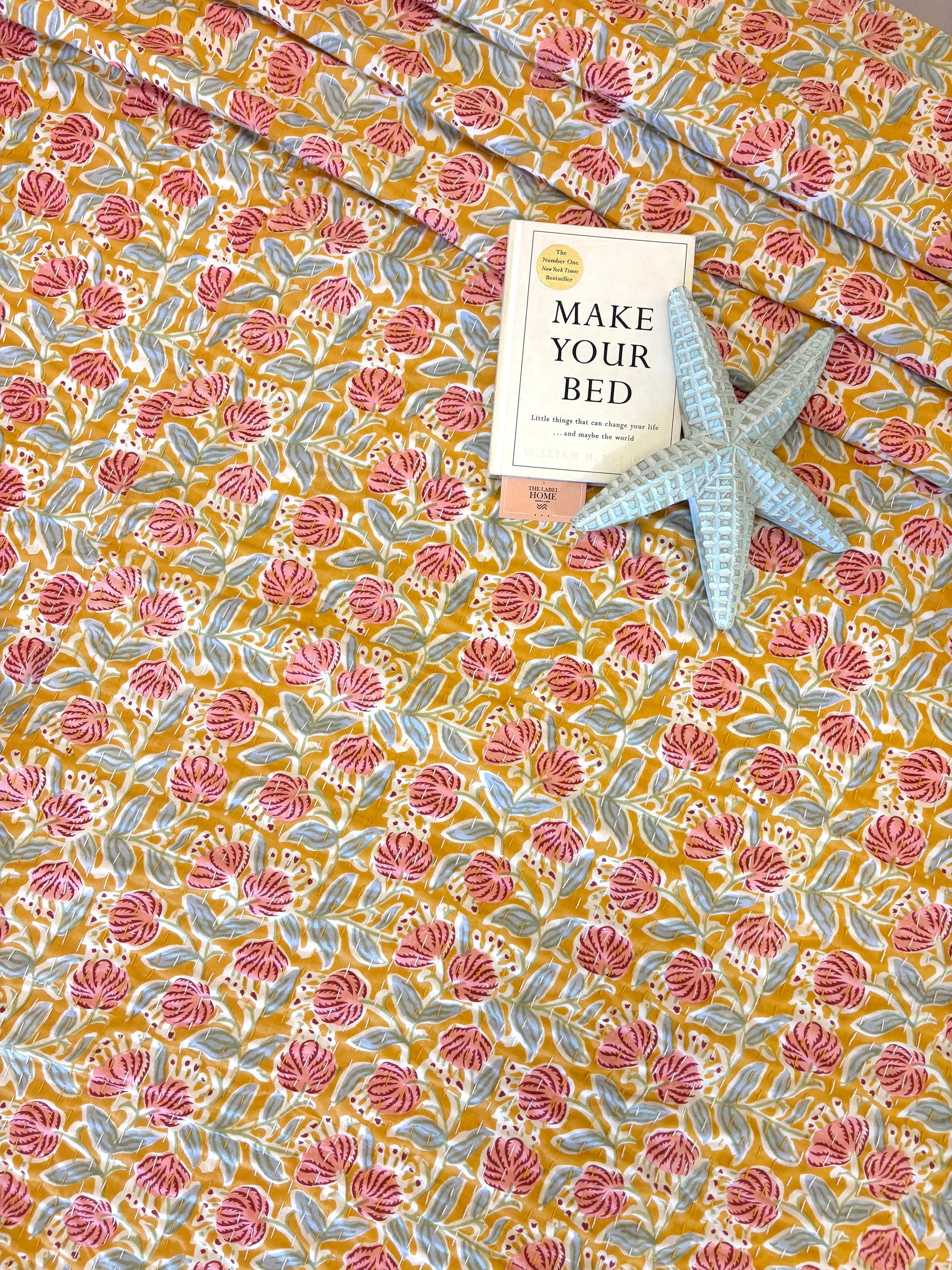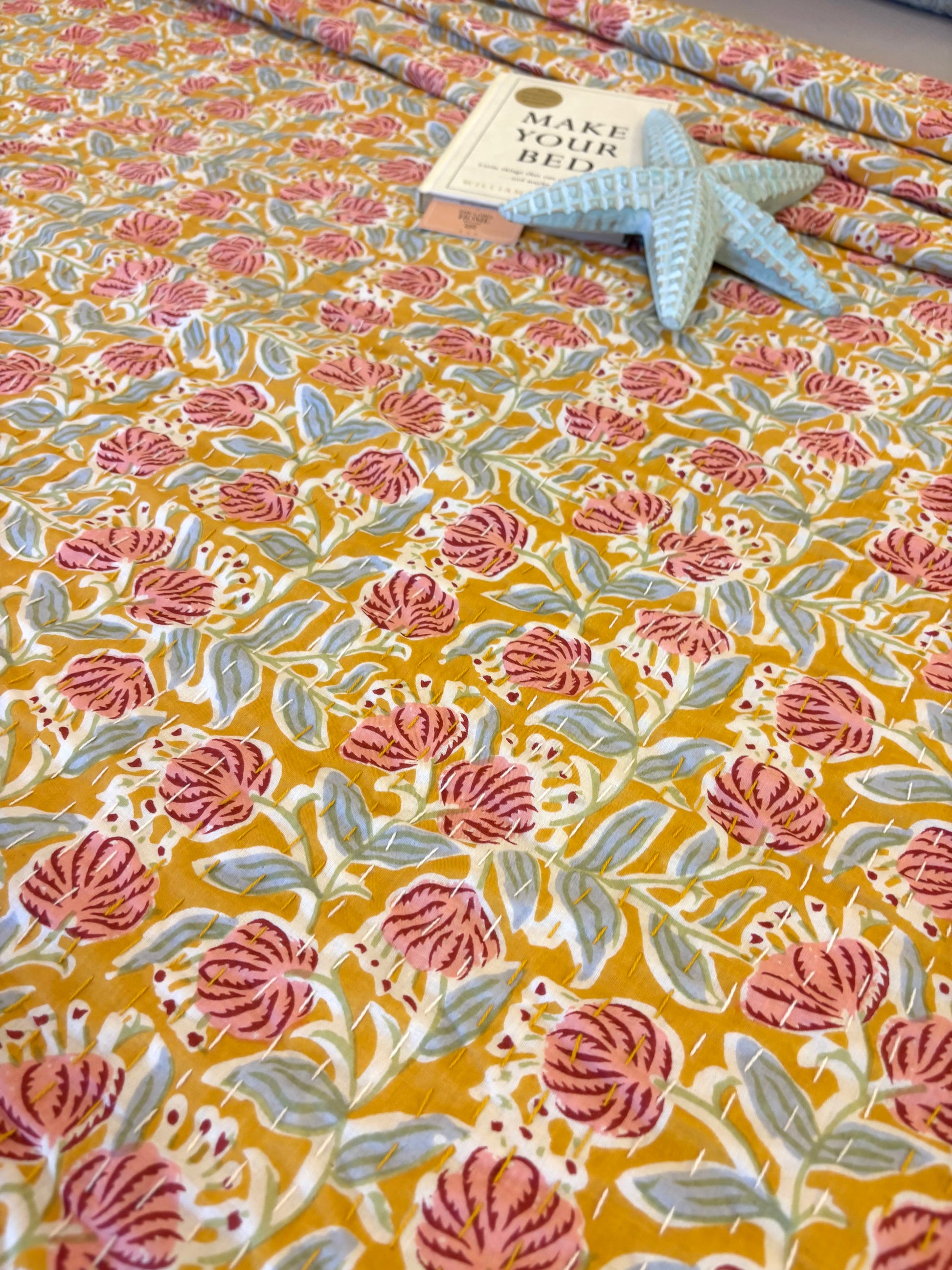 Sunlit Yellow Orange Peach Floral Kantha Bedcover
