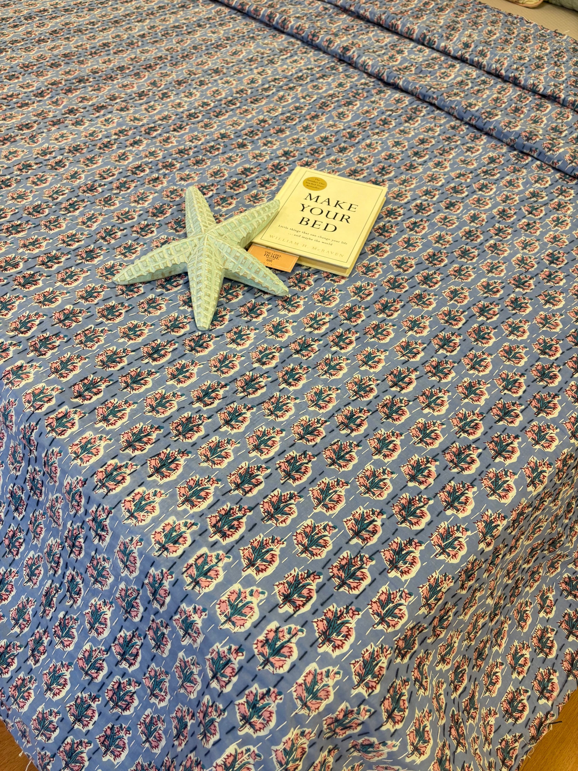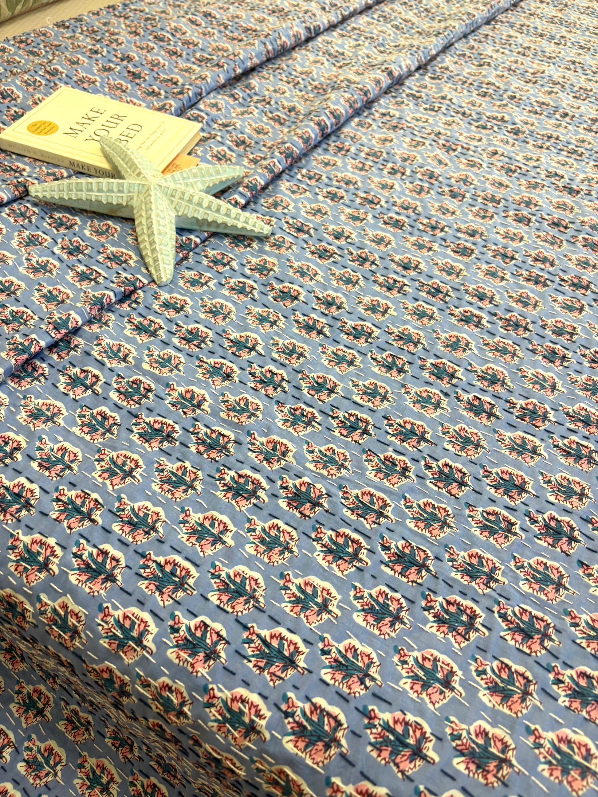 Beautifully handcrafted by artisans in India, this Kantha bedcover is perfect as a bedspread for double beds. You can also get creative — style it as a sofa throw, folded runner, or even a wall hanging.