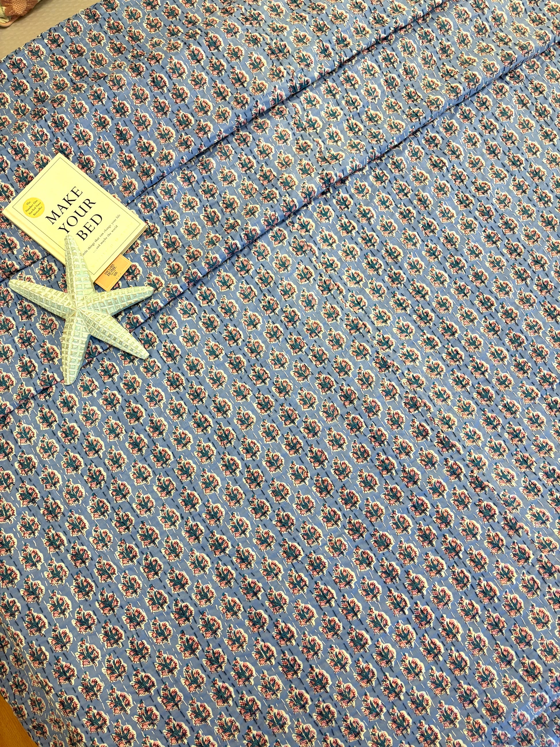 Dusky Blue Motif Kantha Bedcover